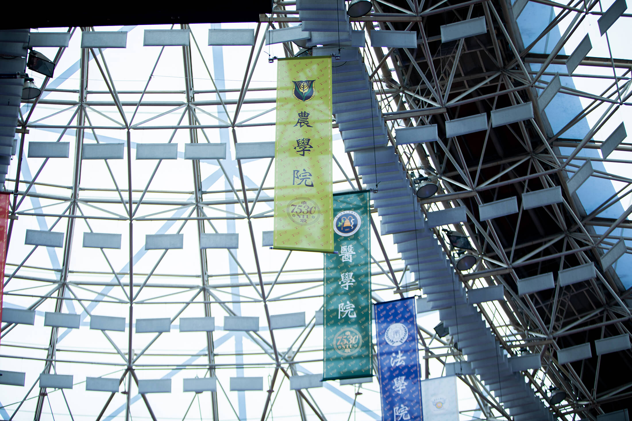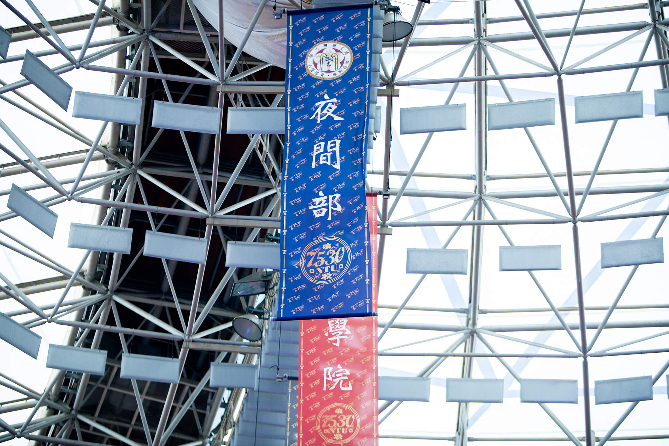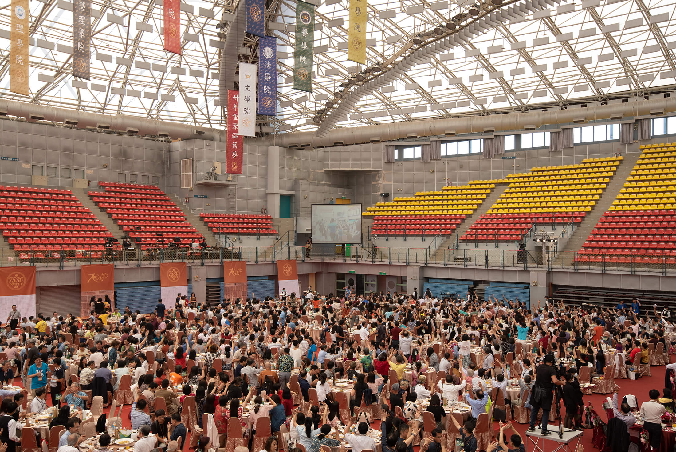 活動過程中最大的亮點,從體育館高空垂吊各院所院旗,是本次 B75 成員現任國立臺北藝術大學教授—楊金源教授一手企劃。