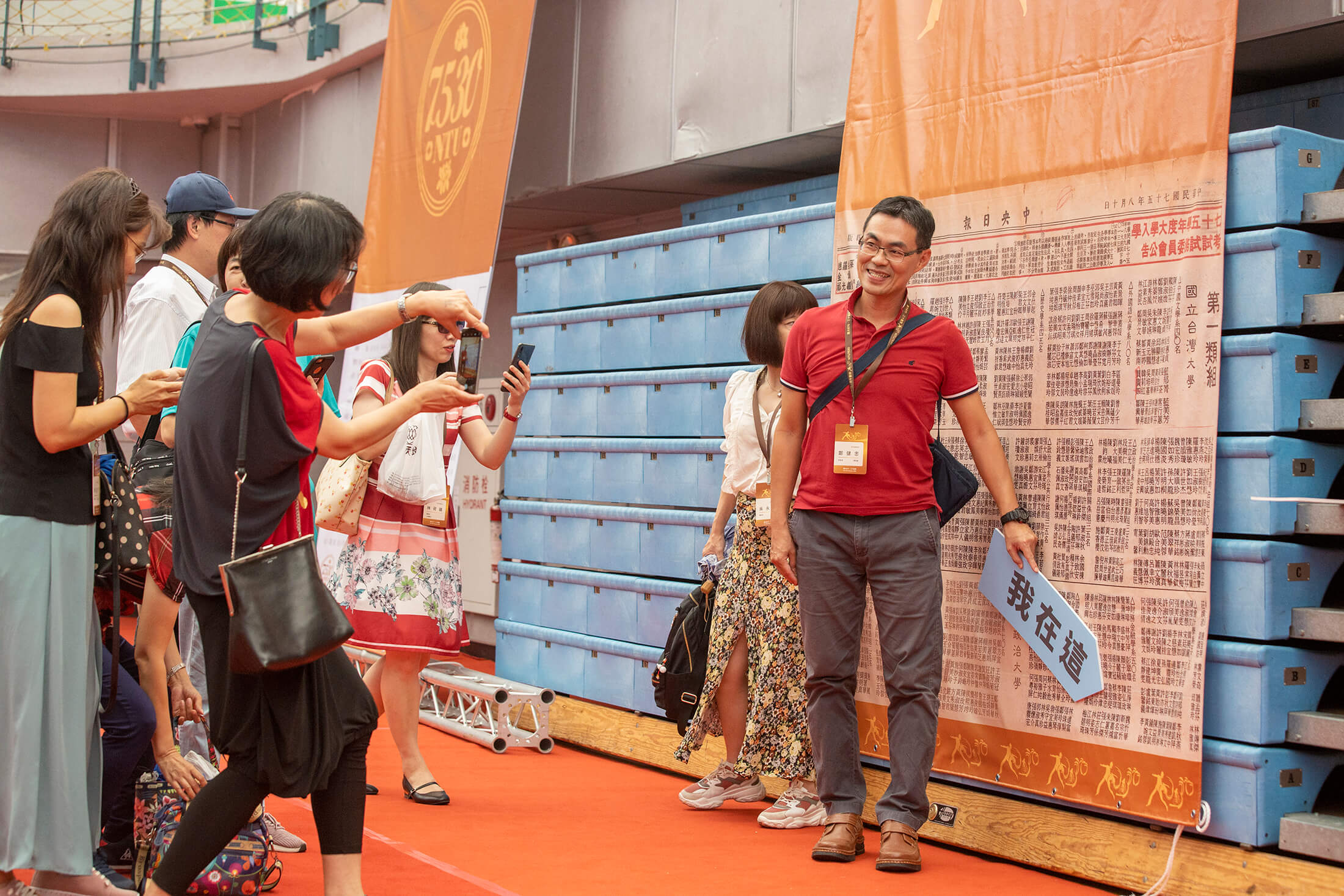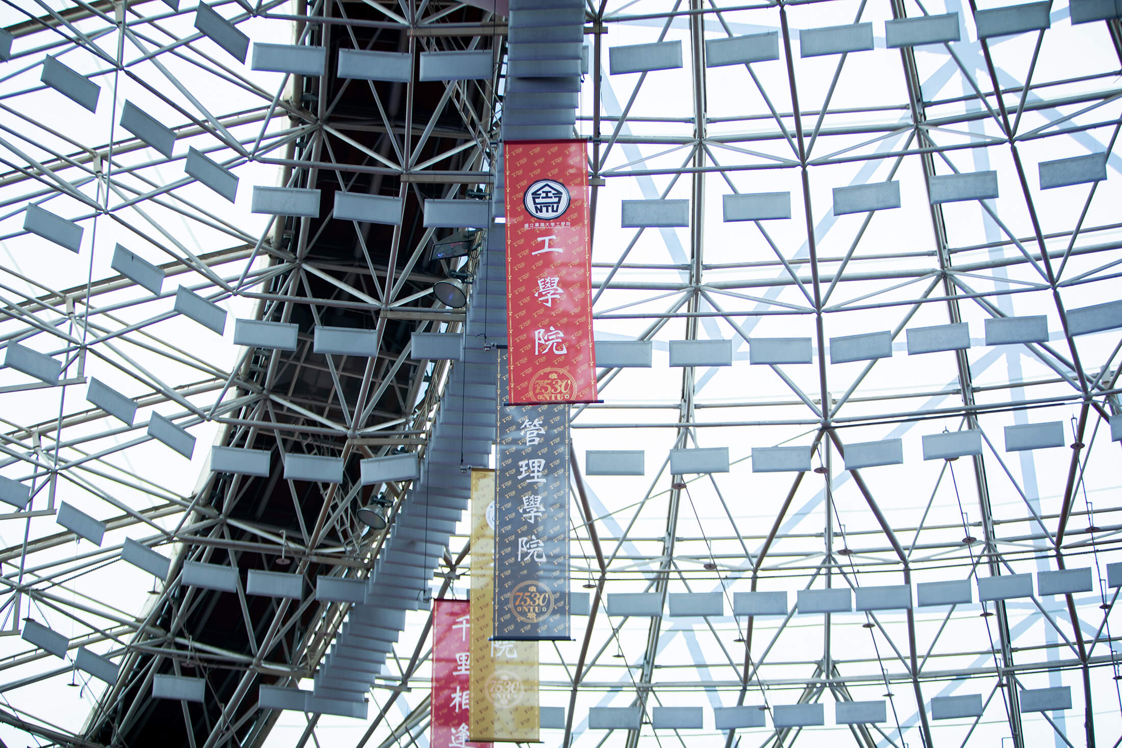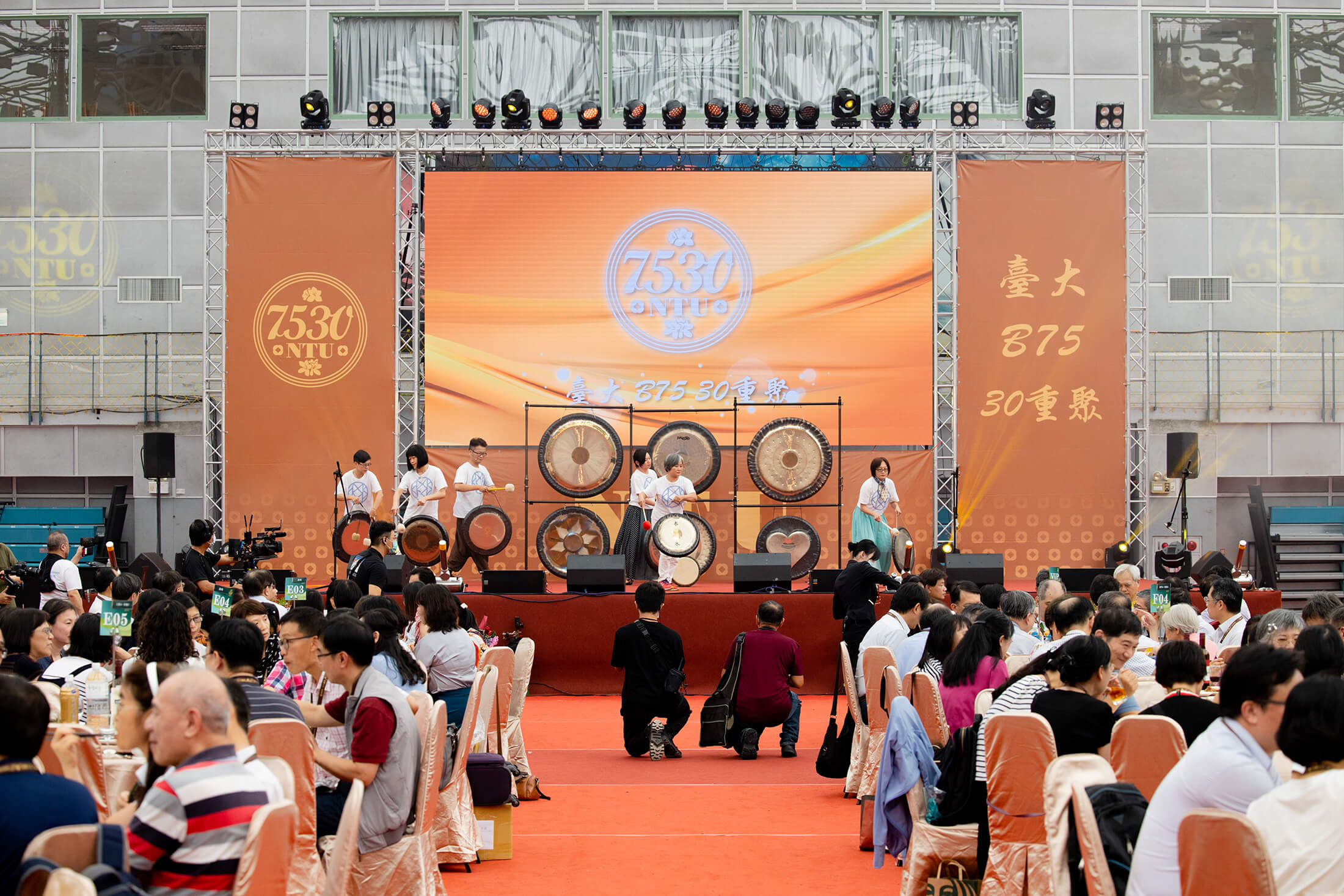 活動過程中最大的亮點,從體育館高空垂吊各院所院旗,是本次 B75 成員現任國立臺北藝術大學教授—楊金源教授一手企劃。